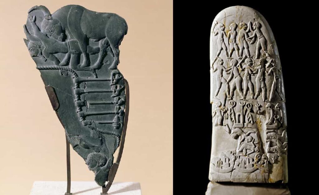 The Palettes of the Lion and the Bull depict the king in the guise of a lion or a bull, engaged in combat against enemies or fortified cities. These themes frequently recur in the iconography of the period and likely offer a representation of actual events.